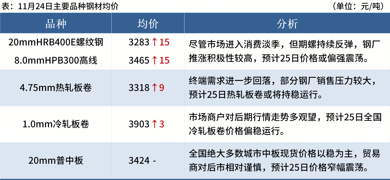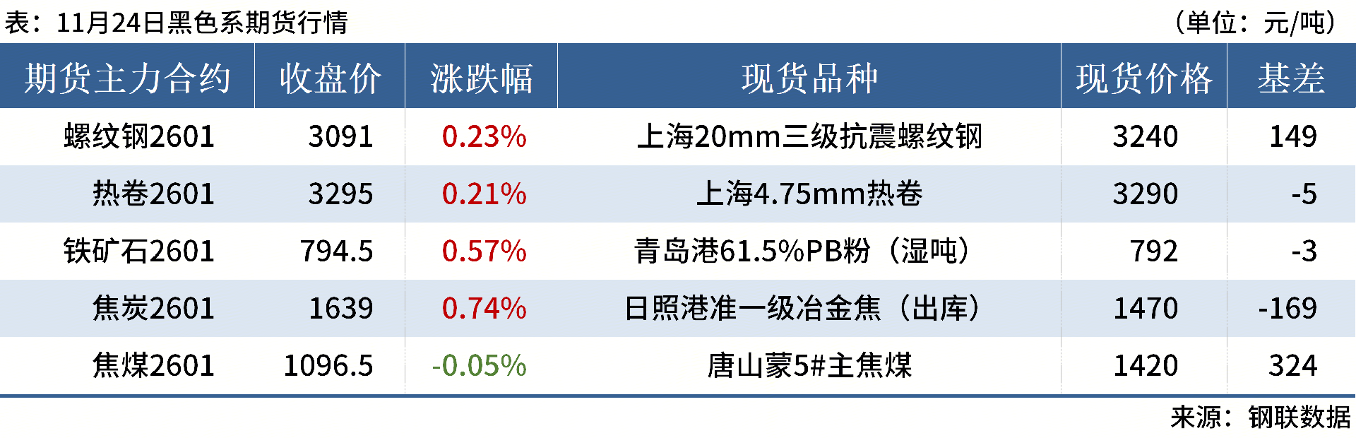◎ 11月24日,全國主港鐵礦石成交112.10萬噸,環(huán)比增22.4%;237家主流貿(mào)易商建筑鋼材成交13.11萬噸,環(huán)比增37.9%。