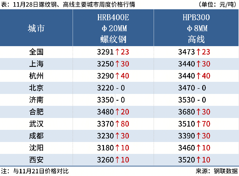 截至11月28日,全國主要城市20mm三級抗震螺紋鋼均價3291元/噸,周環(huán)比上漲23元/噸;8.0mmHPB300高線均價3473元/噸,周環(huán)比上漲23元/噸。
