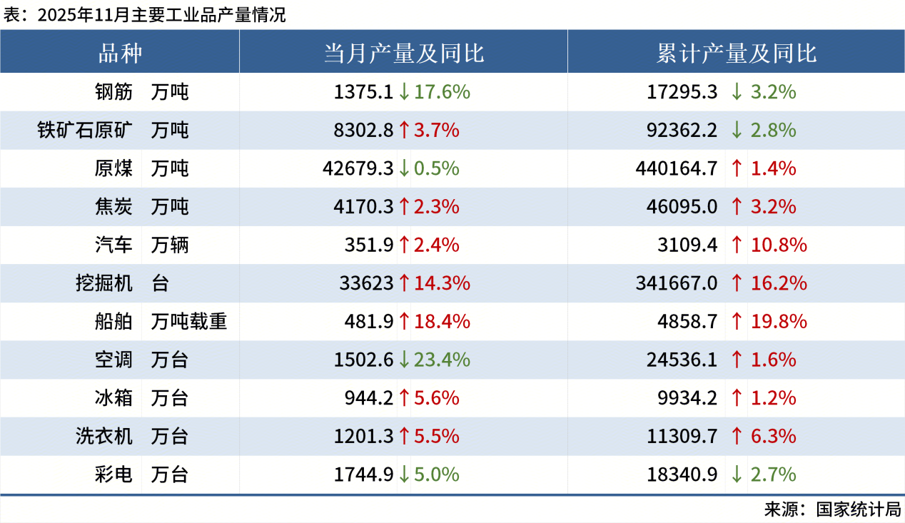 ◎國家統(tǒng)計局?jǐn)?shù)據(jù)顯示,2025年11月份,中國鋼筋產(chǎn)量為1375.1萬噸,同比下降17.6%;1-11月累計產(chǎn)量為17295.3萬噸,同比下降3.2%。其他主要工業(yè)品產(chǎn)量如下: