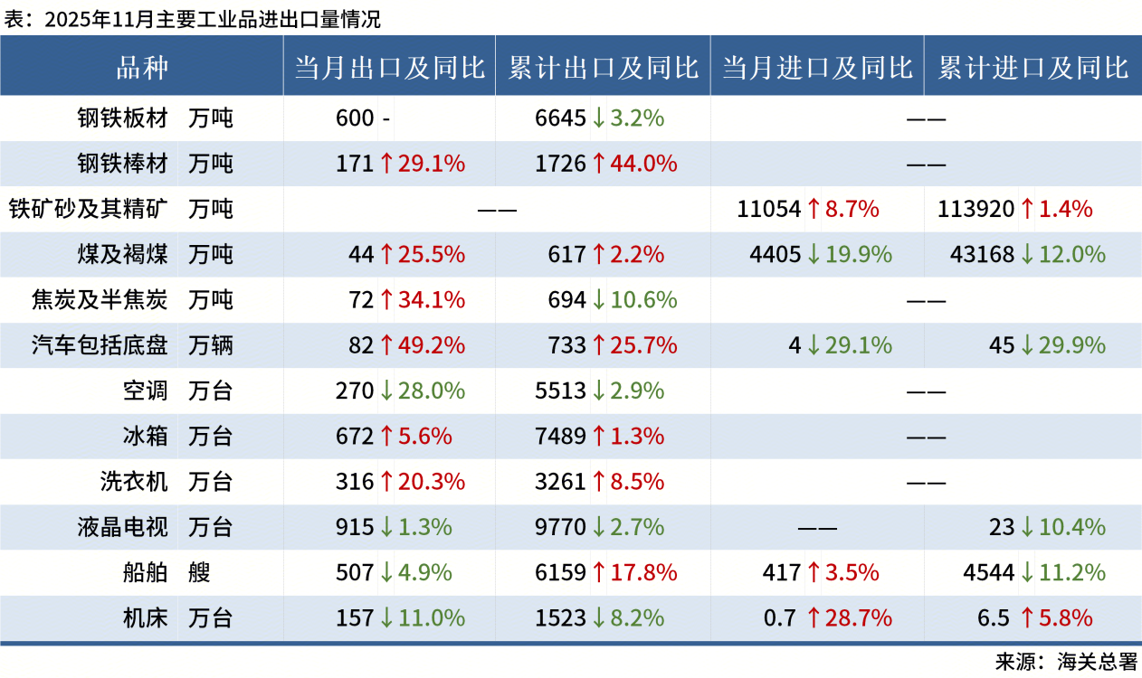 ◎海關(guān)總署數(shù)據(jù)顯示,2025年11月,中國出口鋼鐵板材600萬噸,同比持平;1-11月累計出口6645萬噸,同比下降3.2%。其他主要工業(yè)品進(jìn)出口情況如下: