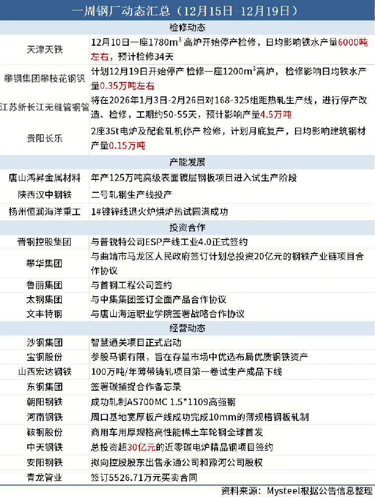 一周鋼廠動態(tài)匯總(12月15日-12月19日)