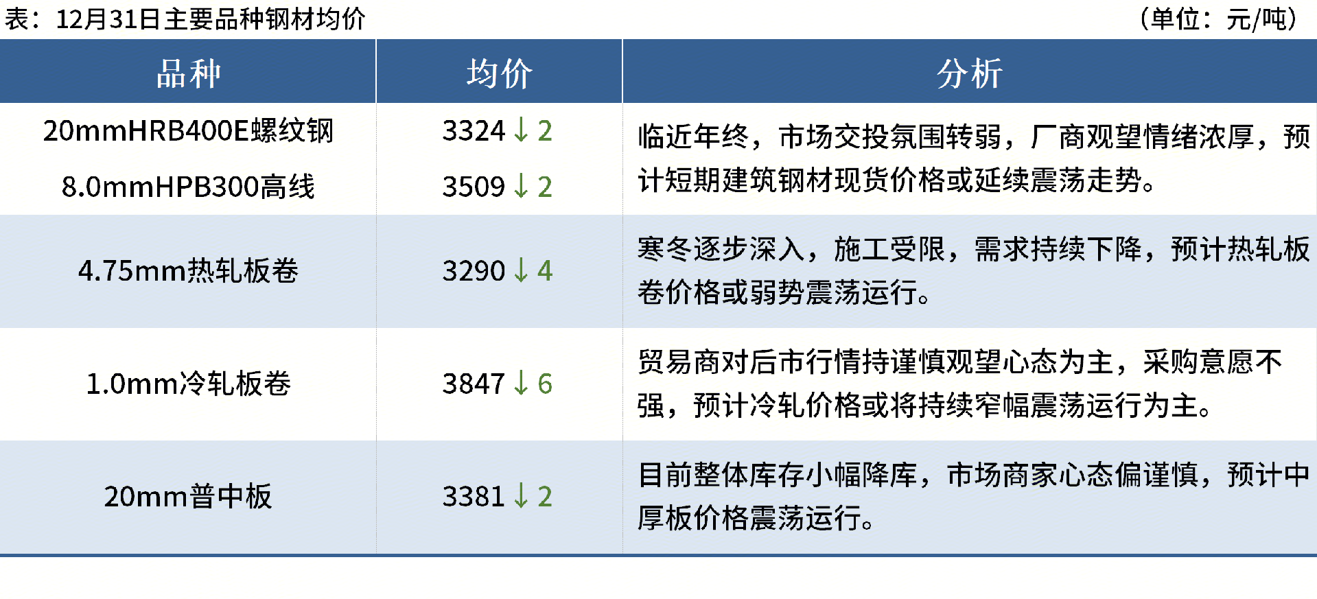 ◎1月3日江蘇永鋼出臺1月上旬出廠價,螺紋鋼平穩(wěn)、線材盤螺上調(diào)50元/噸,現(xiàn)螺紋鋼3450元/噸,線材盤螺3700元/噸。