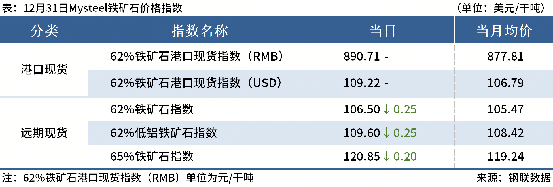 ◎2025年12月31日,全國主港鐵礦石成交61.80萬噸,環(huán)比減55.4%;237家主流貿(mào)易商建筑鋼材成交8.28萬噸,環(huán)比減11.2%。