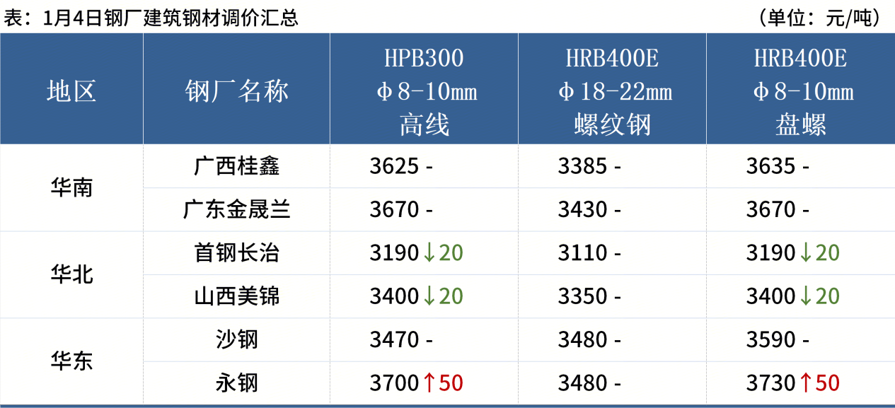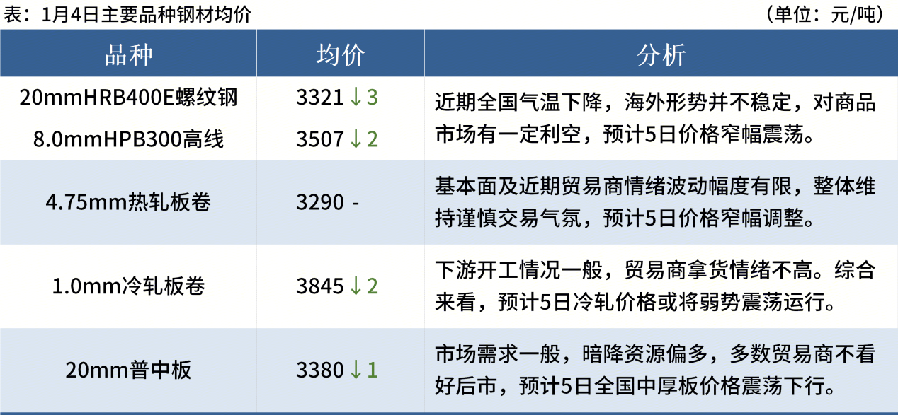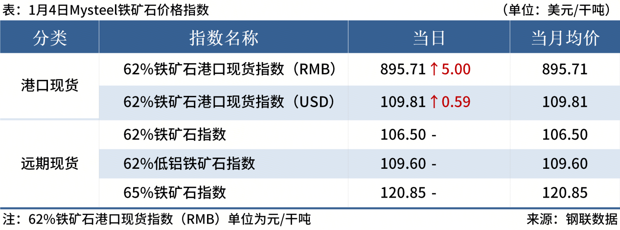 ◎ 1月4日,全國主港鐵礦石成交45.60萬噸,環(huán)比減26.2%;237家主流貿(mào)易商建筑鋼材成交9.10萬噸,環(huán)比增9.9%。