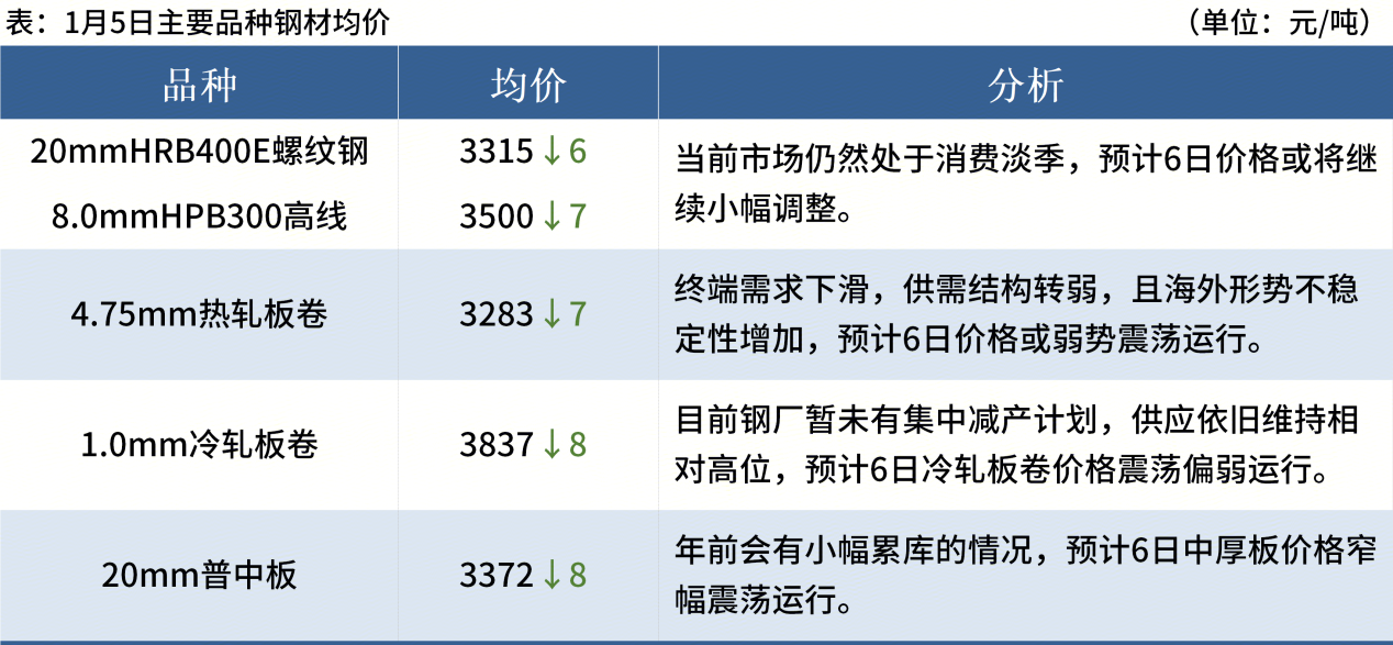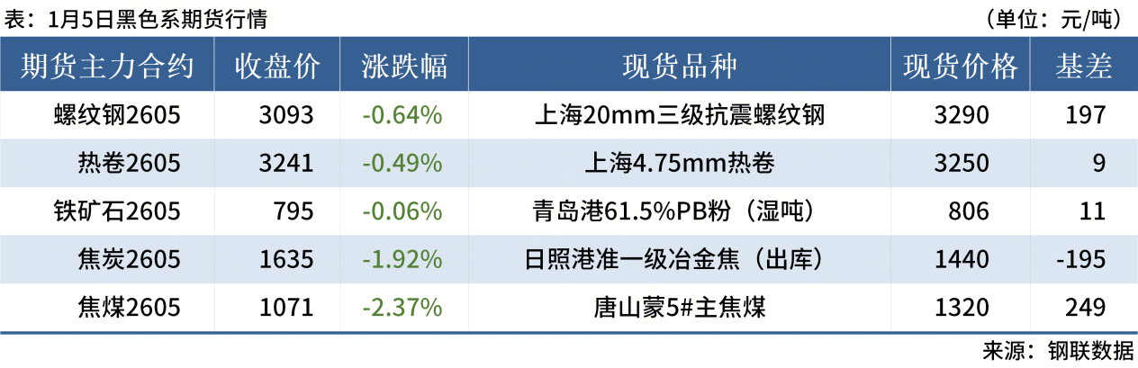 ◎ 1月5日,全國主港鐵礦石成交101.17萬噸,環(huán)比增121.9%;237家主流貿(mào)易商建筑鋼材成交8.68萬噸,環(huán)比減4.6%。
