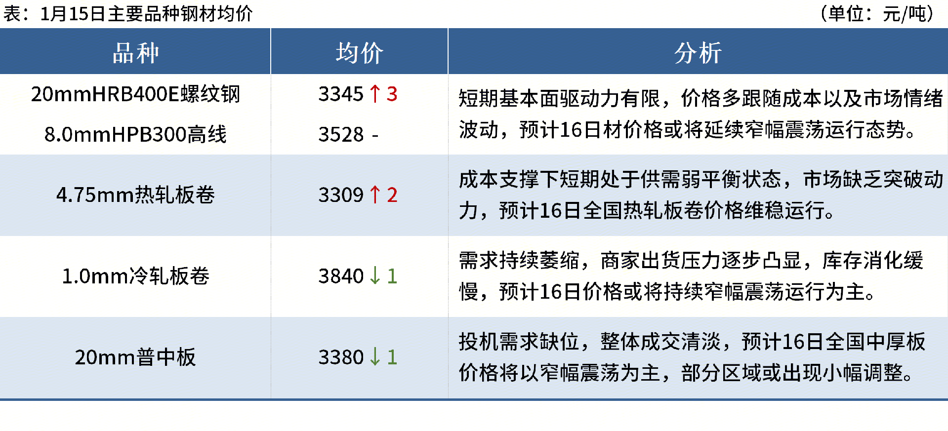 ◎1月15日,76家獨(dú)立電弧爐建筑鋼材鋼廠平均成本為3377元/噸,環(huán)比昨日增加1元/噸,平均利潤(rùn)虧損45元/噸,谷電利潤(rùn)為68元/噸。