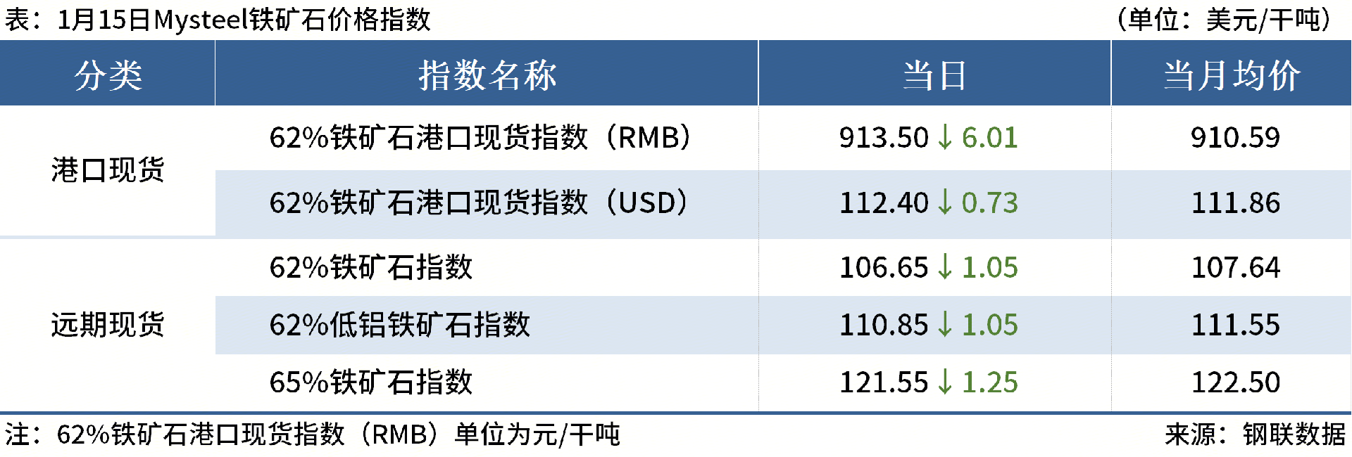 ◎1月15日,全國(guó)主港鐵礦石成交98.12萬(wàn)噸,環(huán)比減20.3%;237家主流貿(mào)易商建筑鋼材成交8.62萬(wàn)噸,環(huán)比減2.7%。