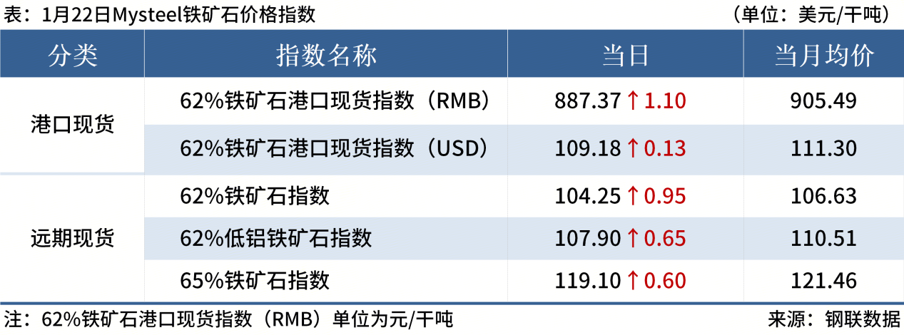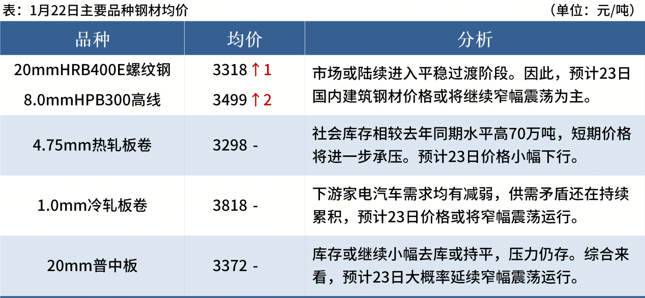 ◎ 1月22日,全國主港鐵礦石成交91.30萬噸,環(huán)比增12.4%;237家主流貿(mào)易商建筑鋼材成交7.15萬噸,環(huán)比減6.3%。