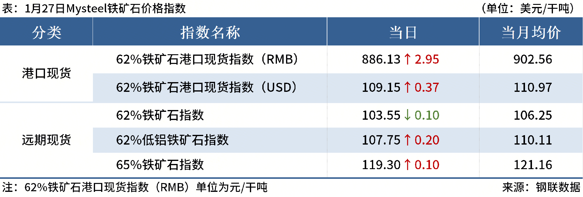 ◎1月27日,全國主港鐵礦石成交80.95萬噸,環(huán)比減23.2%;237家主流貿(mào)易商建筑鋼材成交6.63萬噸,環(huán)比減12.8%。