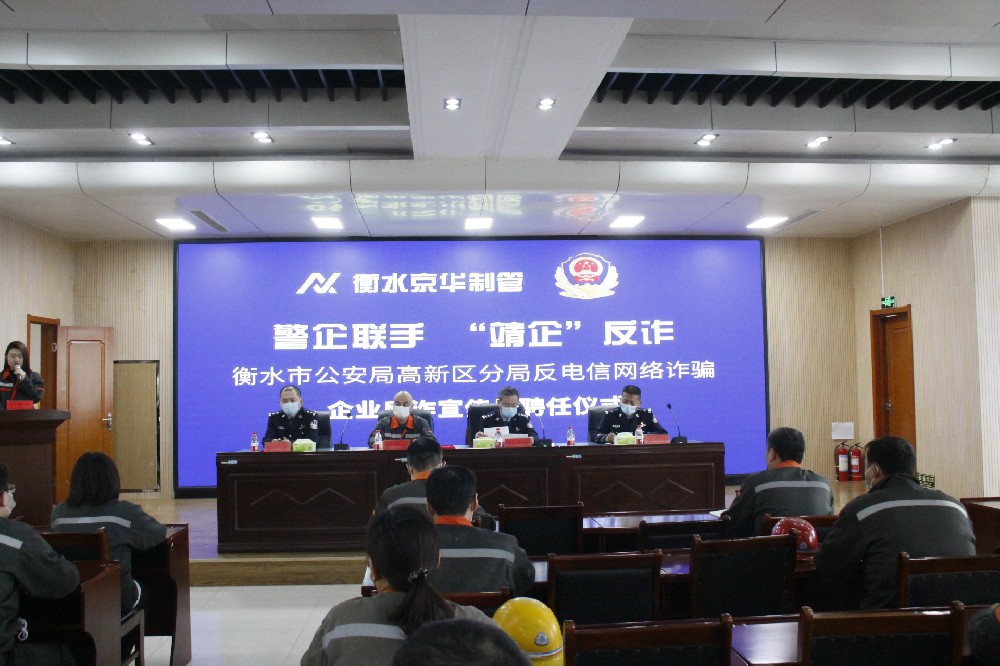 警企聯(lián)手 “靖企”反詐— 衡水京華召開企業(yè)反詐宣傳員聘任儀式4月28日,衡水市公安局高新區(qū)分局黨委委員、副局長(zhǎng)張?bào)K等一行4人蒞臨公司宣傳反詐知識(shí),在公司辦公樓五樓召開了以“警企聯(lián)手,‘靖企’反詐”為主題的企業(yè)反詐宣傳員聘任儀式。公司常務(wù)副總趙志強(qiáng),生產(chǎn)副總劉國(guó)勇,總經(jīng)理助理馬亮同公司員工代表參與會(huì)議。會(huì)議上衡水市公安局···