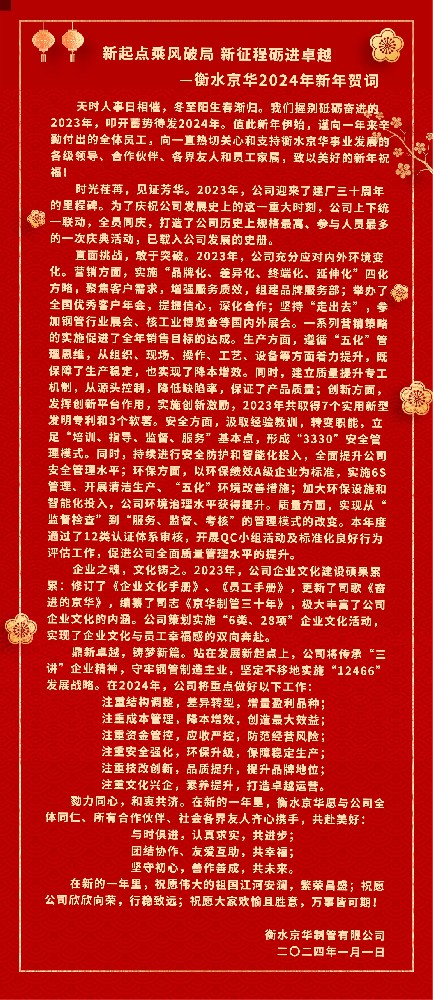 不負(fù)春光起好步 奮楫爭(zhēng)先開新局衡水、鄭州、日照京華舉行新春團(tuán)拜會(huì)龍騰萬(wàn)象更新,春華漸濃人間。為立足新起點(diǎn),錨定新目標(biāo),增強(qiáng)合作凝聚力,2024年3月,衡水、鄭州、日照京華先后在鄭州、長(zhǎng)沙、南昌、杭州、合肥、無(wú)錫舉辦了新春團(tuán)拜活動(dòng)。公司領(lǐng)導(dǎo)團(tuán)隊(duì)與各區(qū)域經(jīng)銷商、行業(yè)專家等歡聚一堂,滿懷美好憧憬,共同邁進(jìn)充滿挑戰(zhàn)和機(jī)遇的新征···